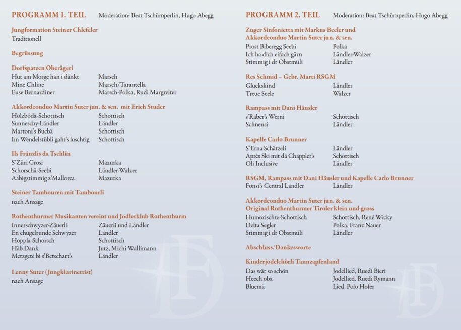 Neben der Zuger Sinfonietta treten zahlreiche weitere Ländlerformationen und Jodelchörli auf.